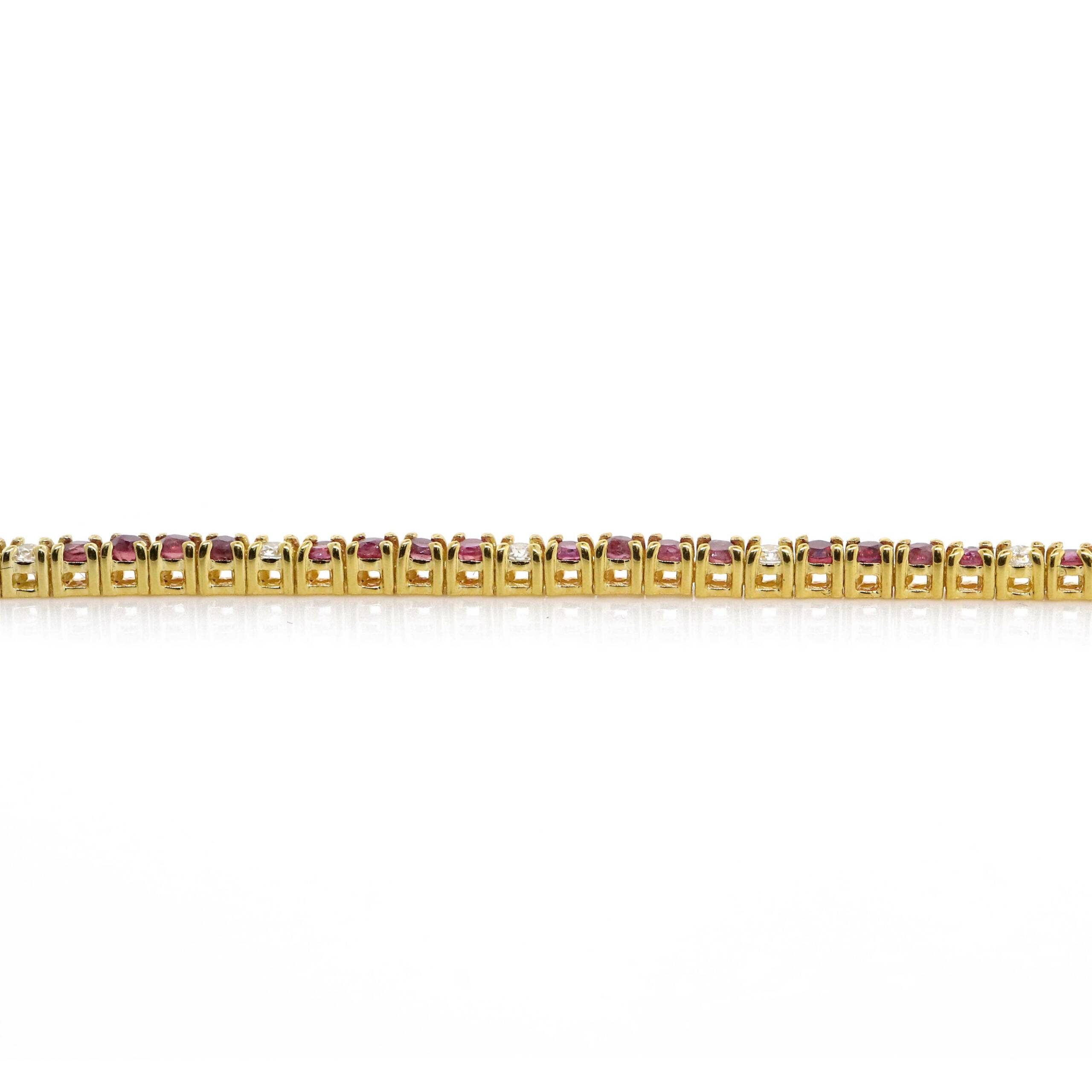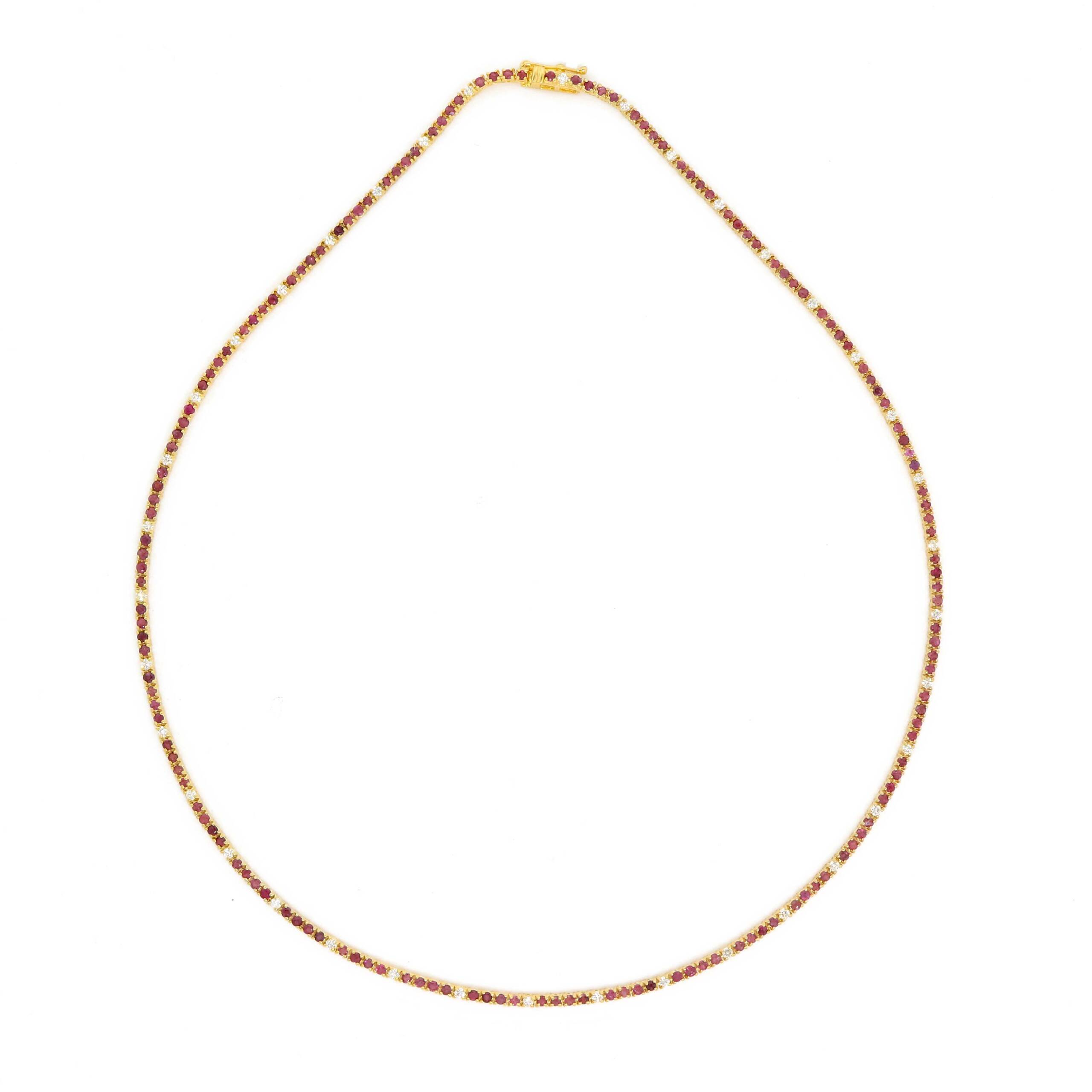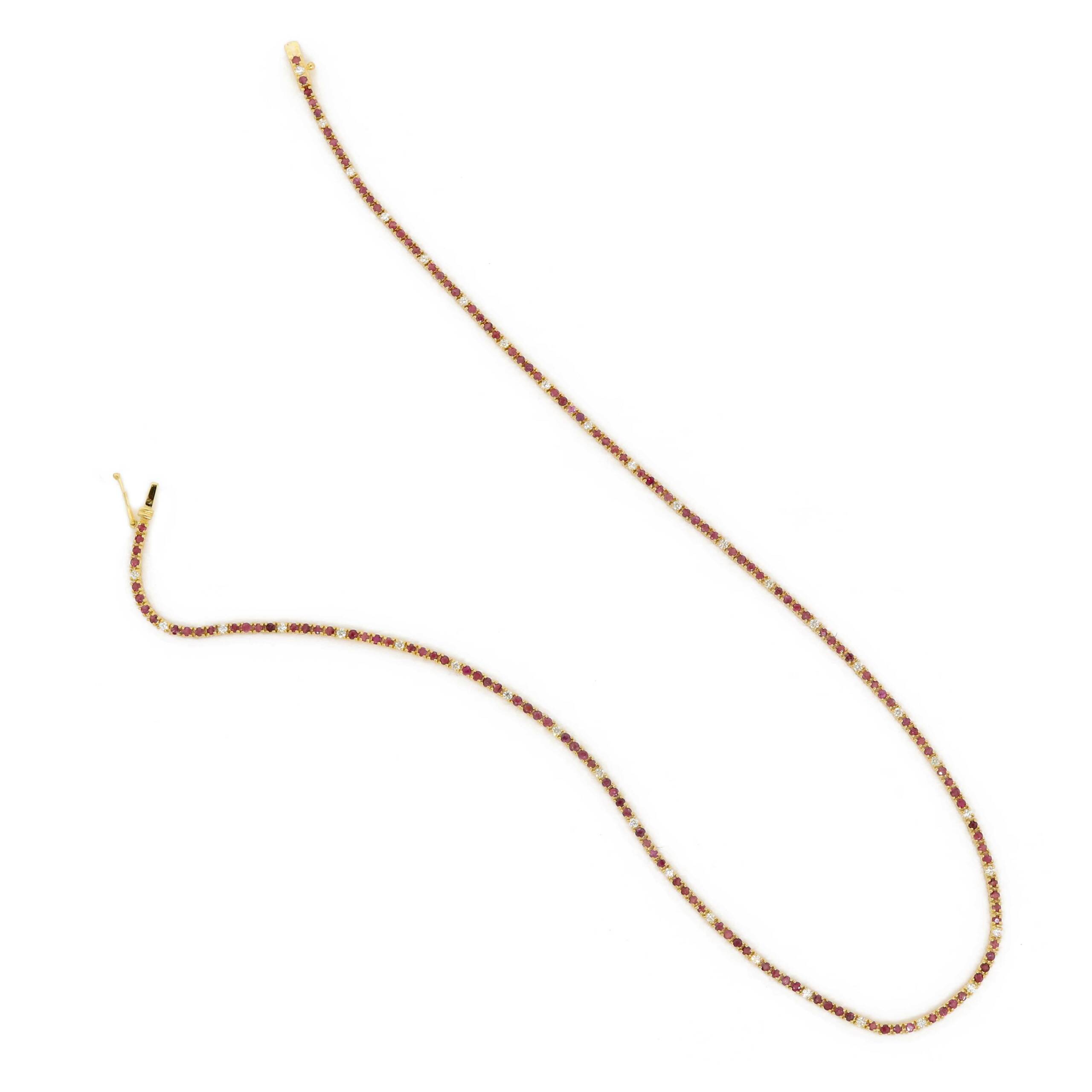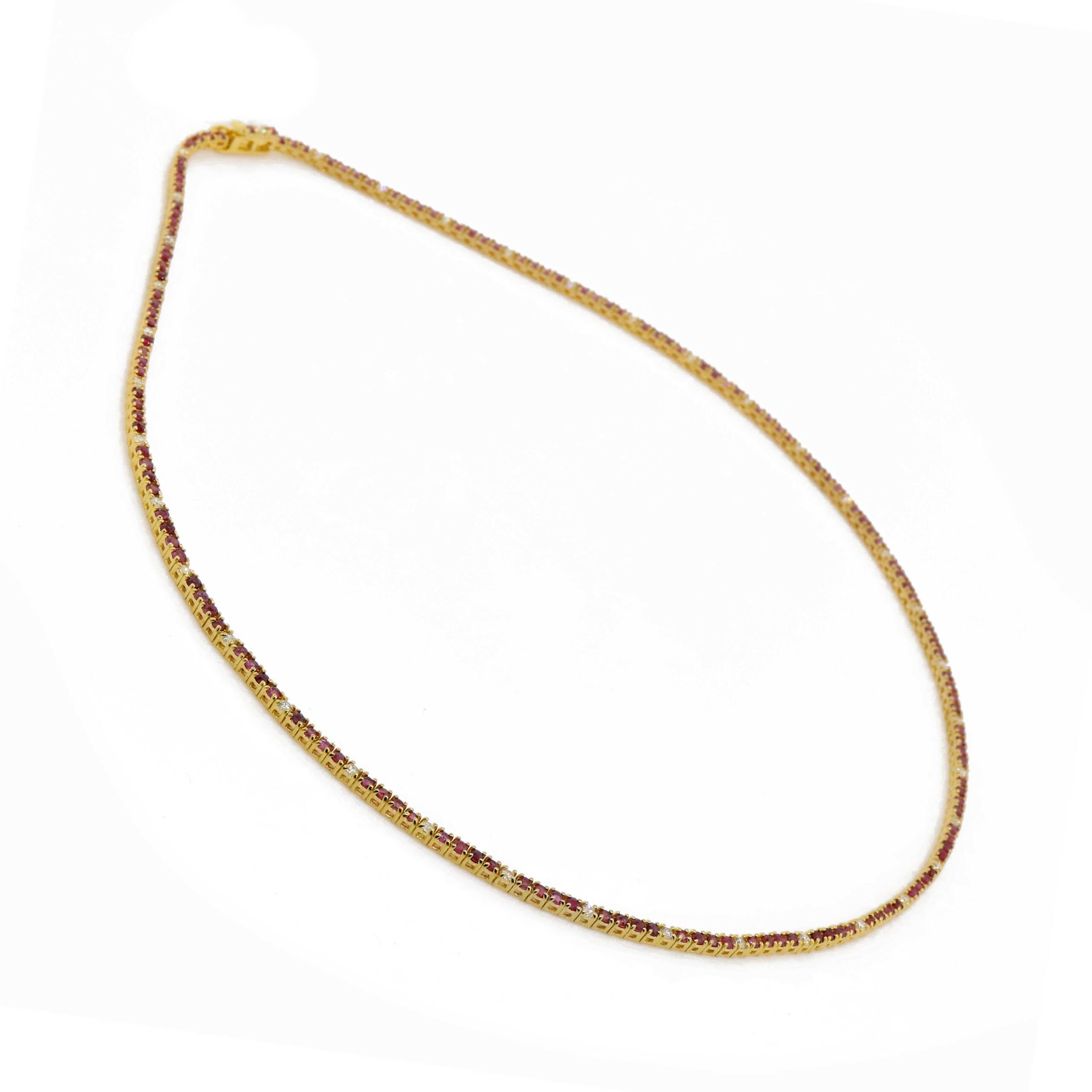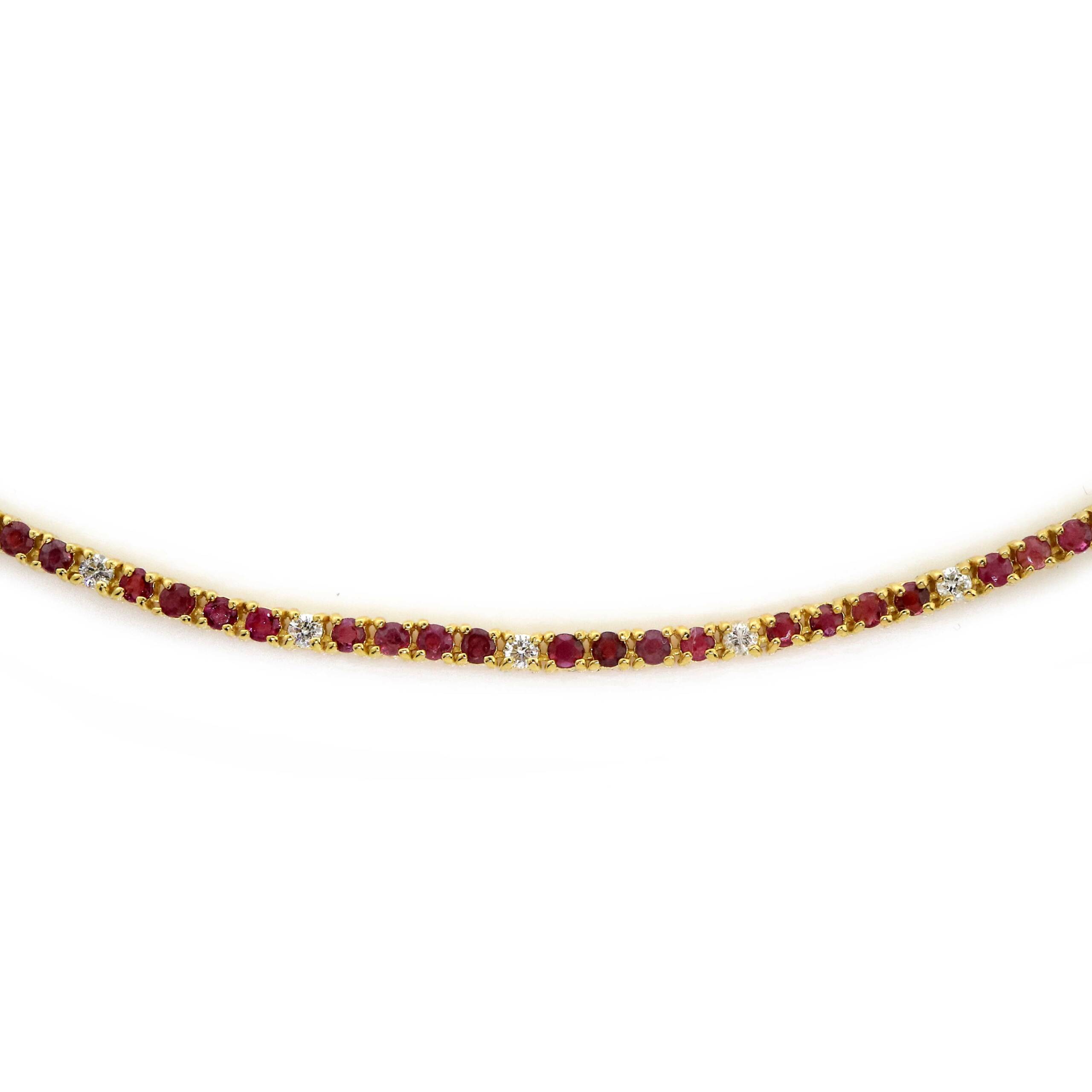 Diamond tennis necklace containing 139 round rubies of about 6.95 carats and 34 round brilliant cut diamonds of about 1.60 carats graded with a clarity of SI2 and color H. All stones are set in a 14k yellow gold setting. The total weight of the necklace is approximately 1.81 grams.